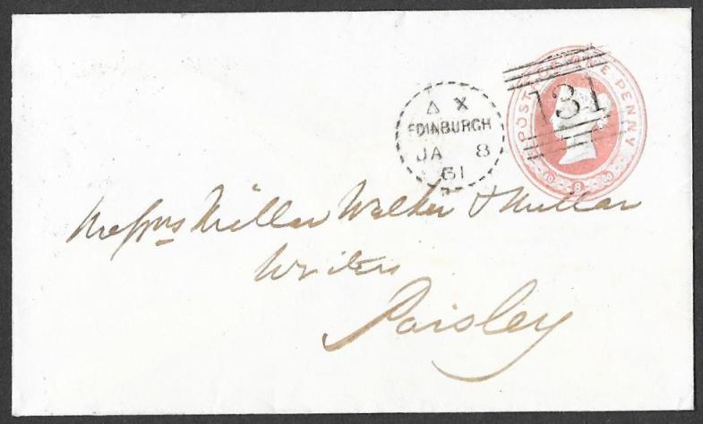 A superb 1d pink embossed envelope sent from Edinburgh to Paisley,
